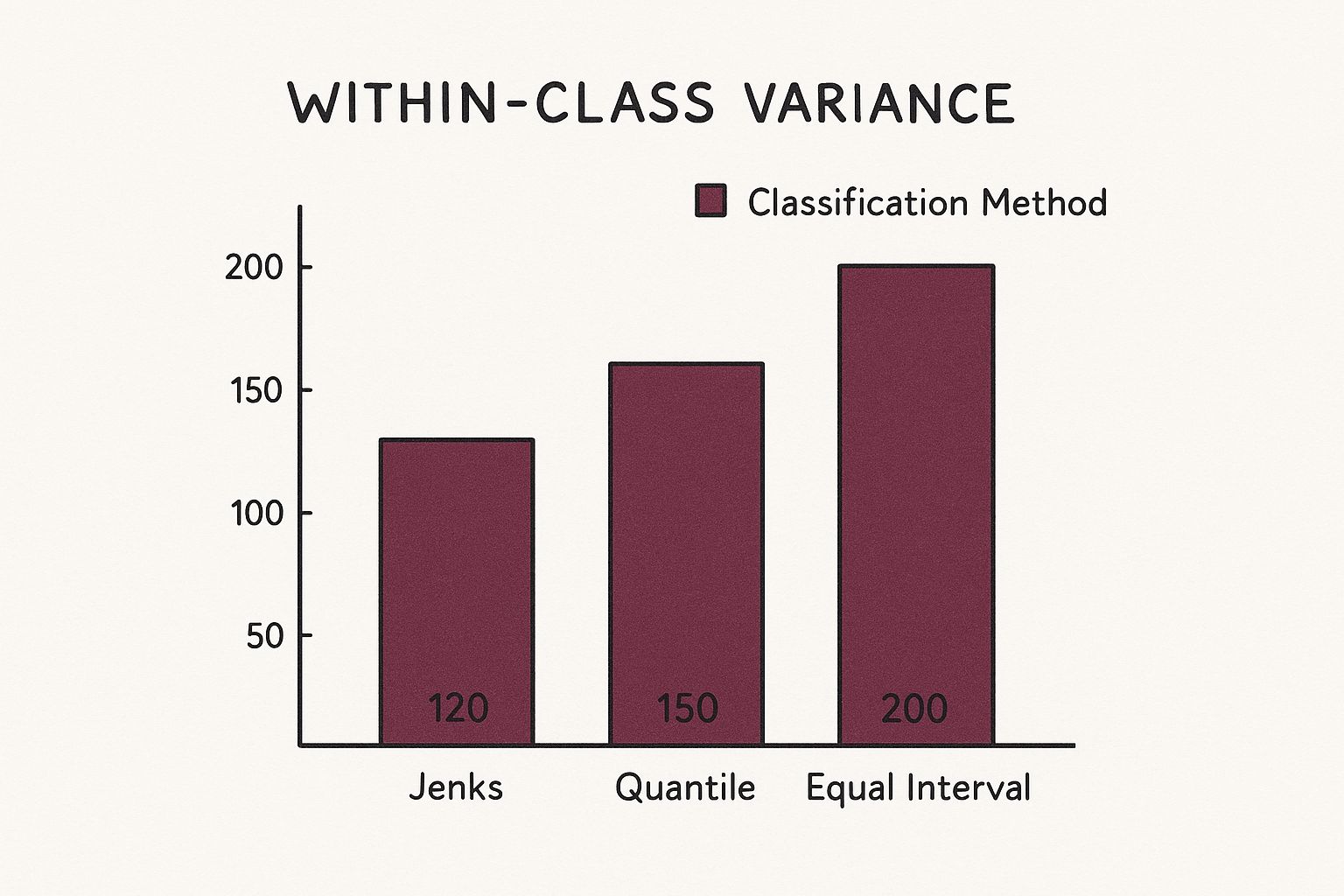 As you can see, the Jenks method does the best job of creating tight, accurate groupings by ensuring the lowest variance within each class.